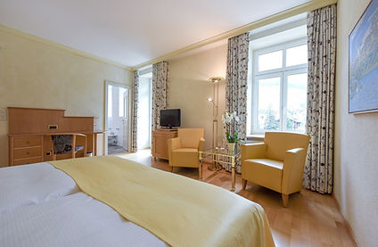 Esposizione soleggiata a sud / Piano nobile (Bel-Etage) / Zona giorno e zona notte separate / Letto matrimoniale 2x2 m / Soggiorno con area salotto e divano, 2 poltrone e tavolino, oltre a scrivania / Bagno con vasca, WC, bidet e doppio lavabo / WC separato aggiuntivo / Atrio con armadio e area guardaroba / Moquette / Minibar